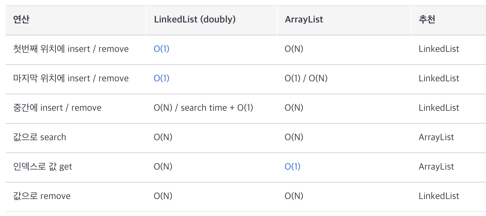 ArrayList의 배열 공간이 꽉 차거나, 요소 중간에 삽입 경우 배열을 복사하는 과정에서 시간이 많이 들거같지만, 사실 내부적으로 최적화가 잘 되어 있어서 성능면에서 크게 차이가 없다.