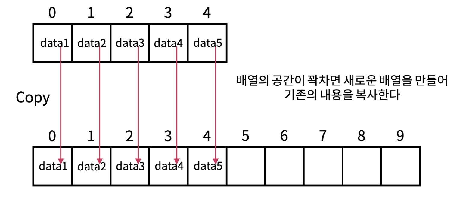 - 일반적으로 기존 배열의 크기는 10이며, 새로운 배열을 생성할 시 1.5배 확장