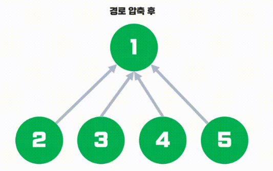 그 결과 경로를 압축한 노드들에 대해서는 부모 노드가 이미 root로 갱신된 상태이므로 또 다시 재귀를 통해 root 노드를 찾아나서는 비용을 아낄 수 있다.